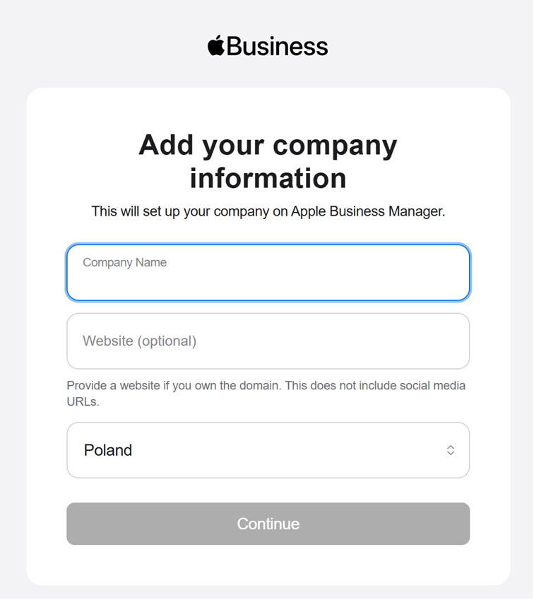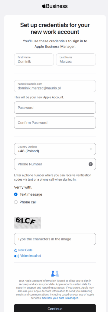 Nie masz konta? Kliknij „Utwórz Apple ID” i postępuj zgodnie z instrukcjami. Konto Apple będzie potrzebne do zarządzania Twoim profilem firmowym.