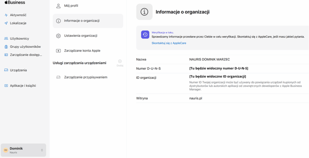 Apple poprosi Cię o potwierdzenie, że jesteś właścicielem lub upoważnionym przedstawicielem firmy.